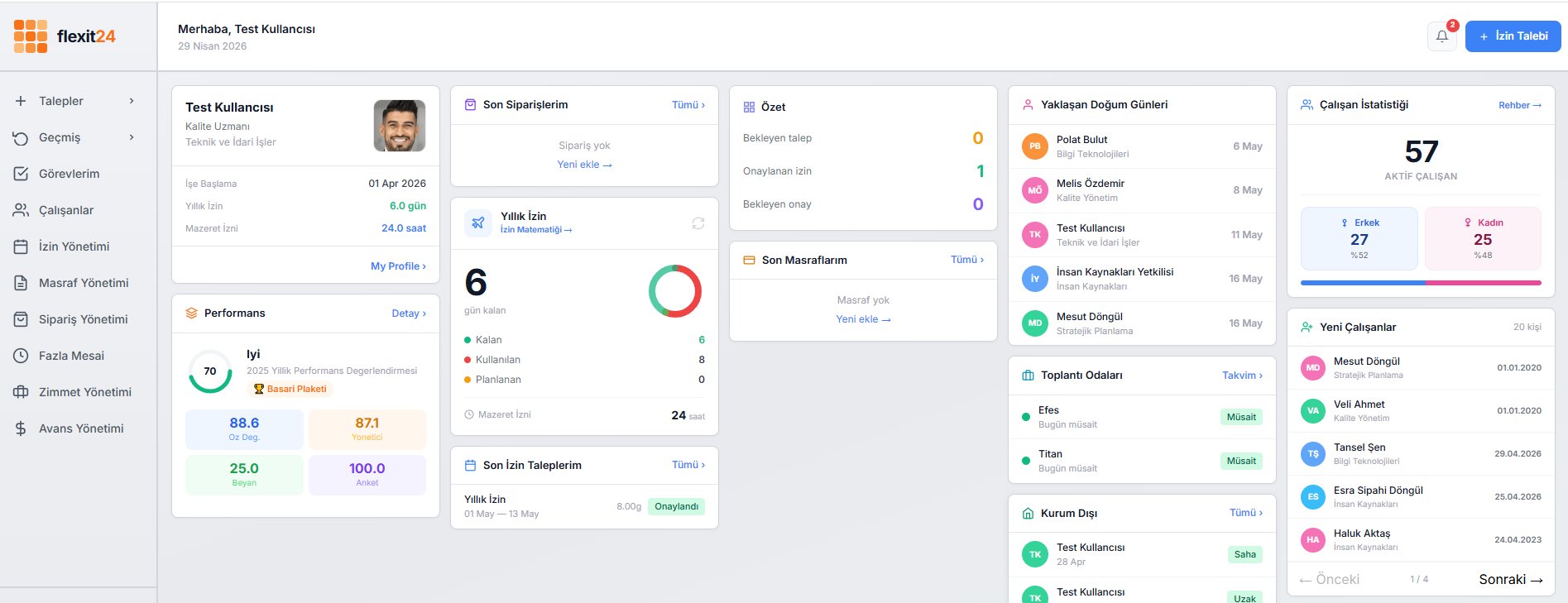 İzin, Masraf, Zimmet, Proje, Performans platformlarında karışık yönetim.